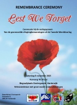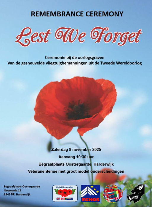 • REMEMBRANCE DAY OOSTERGAARDE HARDERWIJK Ik heb de eer u uit te nodigen voor de Herdenkingsceremonie voor gesneuvelde vliegtuigbemanningen uit de Tweede Wereldoorlog. 11 november is Remembrance Day in the Commonwealth of Nations. Als Stichting “We Will Remember”, organiseren wij een herdenking op de zaterdag dichtbij deze datum. Dit jaar zal dit plaatsvinden op zaterdag 8 november 2025 op de Begraafplaats Oostergaarde, Oosteinde 12 in Harderwijk. Aanvang 10.30 uur. Veteranen van Veteranencafe Alleman Harderwijk zullen hierbij een krans leggen. Tenue: Veteranenpak met groot model decoraties. Wij hopen u te mogen begroeten. |