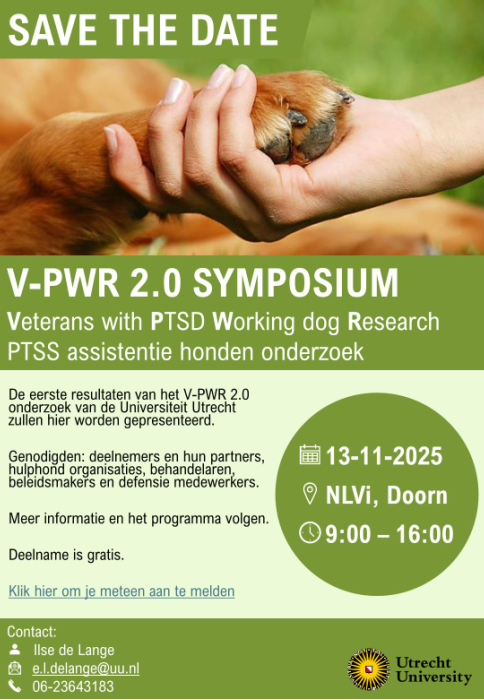 Hierbij een uitnodiging en het programma voor het symposium over mijn onderzoek op 13 november a.s. bij het NLVi. Hier ga ik alvast wat eerste resultaten presenteren, en daarnaast zijn er nog andere praatjes over hulphonden voor veteranen met PTSS. Iedereen die geholpen heeft met mijn onderzoek is uitgenodigd om te komen, dus als jullie geïnteresseerd zijn of mensen kennen die interesse hebben in dit onderwerp zijn jullie van harte welkom! (1025) Met vriendelijke groeten, Ilse de Lange |